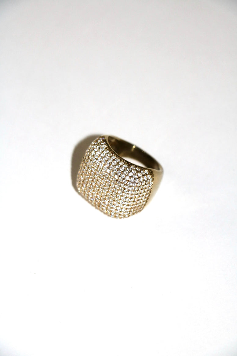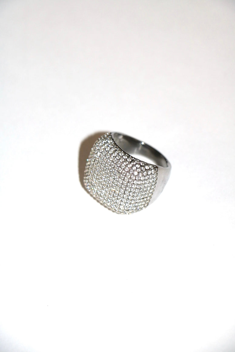 A striking statement ring with a bold square design softened by rounded edges. Covered in zirconia crystals across the entire surface, it radiates intense sparkle from every angle. Glamorous and eye catching, this piece is crafted to stand out.