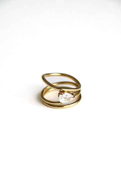 Embrace the beauty of contrast with this striking asymmetrical ring, featuring a delicate zirconia crystal set at its center. Its sculptural, organic lines create a modern yet ethereal feel, blending artistry with refined simplicity.